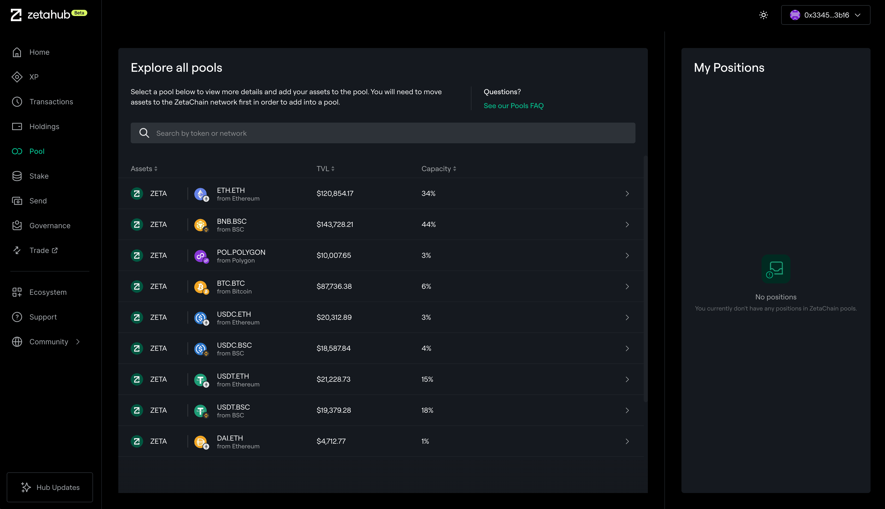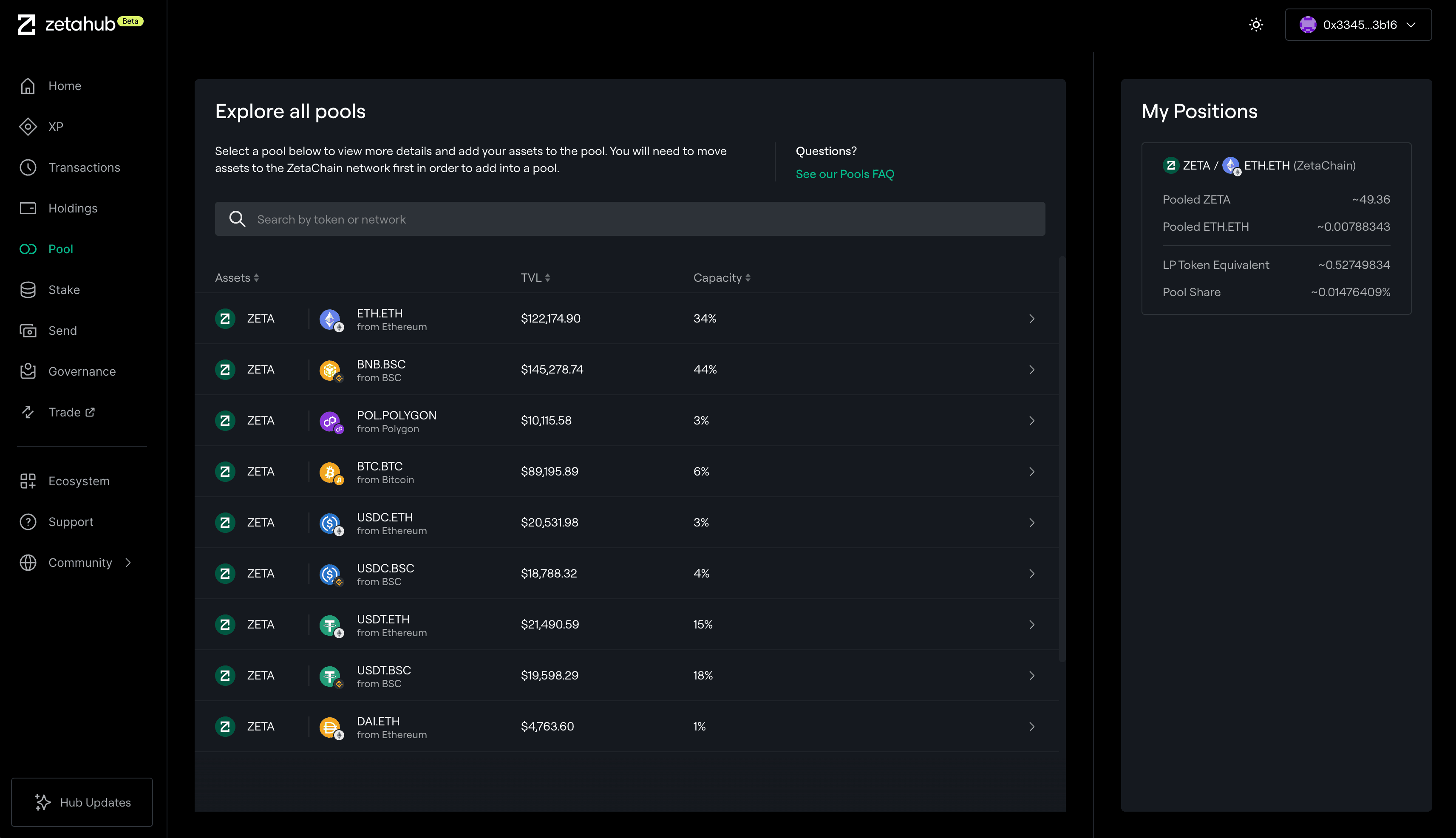 To get started, view the list of ZetaChain liquidity pools on the Pool page and select one.